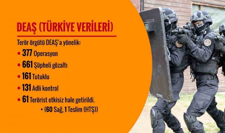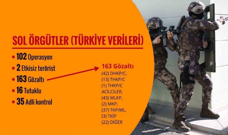 Bakan Yerlikaya sosyal medya hesabı üzerinden yaptığı paylaşımda, Bölücü Terör Örgütü’ne (BTÖ) yönelik operasyonlarda, 2’si kırmızı, 6’sı turuncu, 17’si gri kategoride olmak üzere, 309 terörist etkisiz hale getirildiğini, gözaltına alınan bin 810 şüpheliden 433’ünün tutuklandığını ve 336’sı hakkında adli kontrol kararı verildiğini aktardı. Ayrıca, FETÖ’ye yönelik bin 786 operasyon yapıldığını, gözaltına alınan 2 bin 689 şüpheliden 536’sının tutuklandığını ve 457’si hakkında adli kontrol kararı verildiğini duyurdu. DEAŞ Terör Örgütüne yönelik faaliyetlerde, 357 operasyonda, 61 teröristin etkisiz hale getirildiğini, 661 kişi gözaltına alınırken, 161’inin tutuklandığını ve 131’i hakkında adli kontrol kararı verildiğini paylaştı. Paylaşımda Sol terör örgütlerine yönelik 102 operasyonda 2 teröristin etkisiz hale getirildiği aktarılırken gözaltına alınan 163 şüpheliden 16’sı tutuklandı ve 35’i hakkında adli kontrol kararı verildi. Bakan Yerlikaya ayrıca, 120 gün içinde emniyet ve jandarma personeli 57’si bombalı eylem olmak üzere 68 eylemin önlendiğini paylaştı.