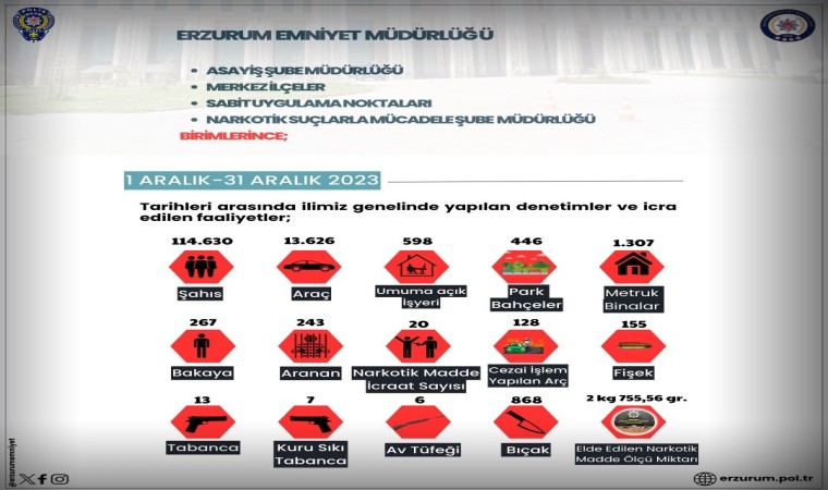 Edinilen bilgiye göre, son bir ay içerisinde yapılan denetimlerde 114 bin 630 şahıs kontrol edildi. 23 bin 626 araç, 598 umuma açık işyeri, 446 park bahçe, 1307 metruk bina kontrol edildi. 128 araç hakkında cezai işlem uygulanırken, 20 narkotik uygulaması gerçekleştirildi. Yapılan uygulamalarda 13 tabanca, 7 kuru sıkı tabanca, 6 av tüfeği, 868 bıçak ele geçirildi. Yapılan çalışmalarda aynı dönemde 2 kg 755,56 gr uyuşturucu yakalandı.