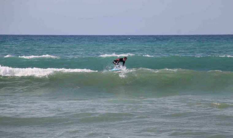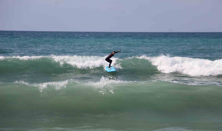 Antalya’nın Alanya ilçesinde sörfçüler, dalgalı denizi fırsat bilip sörf yapma keyfi yaşadı.