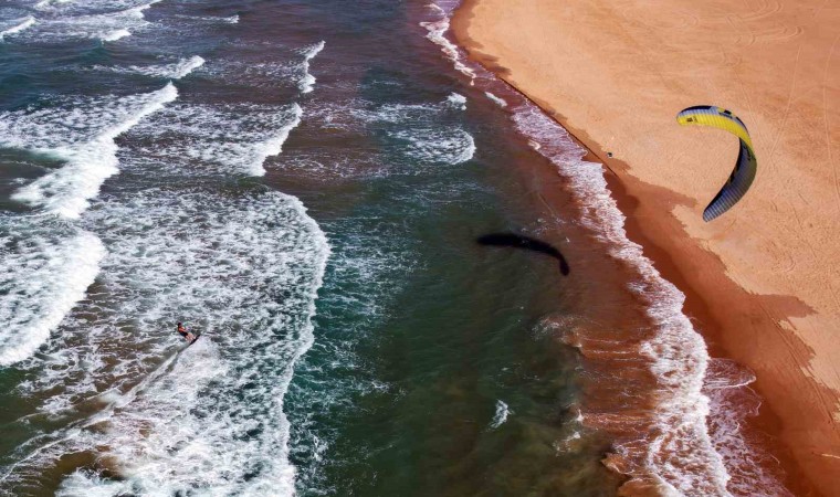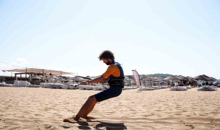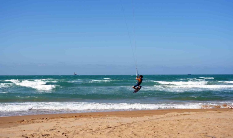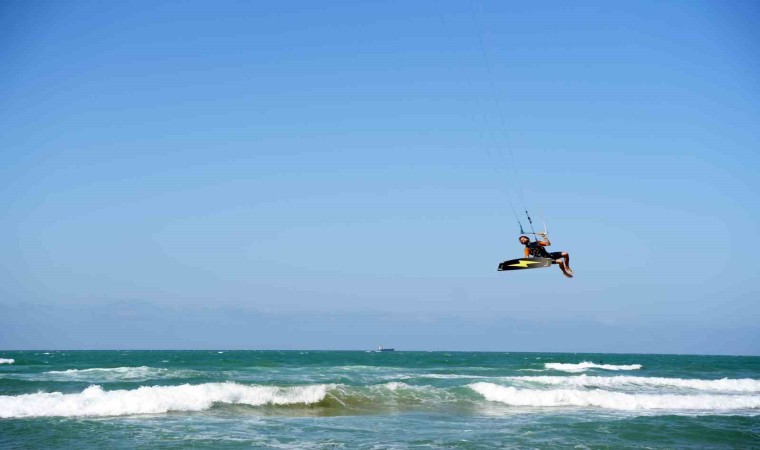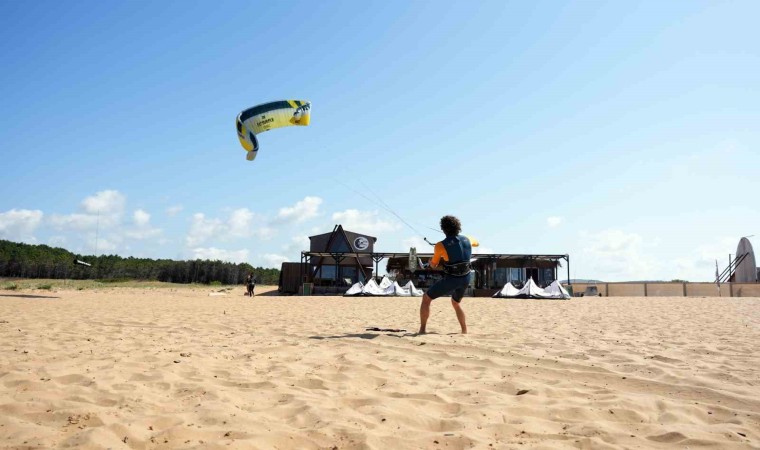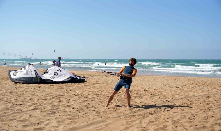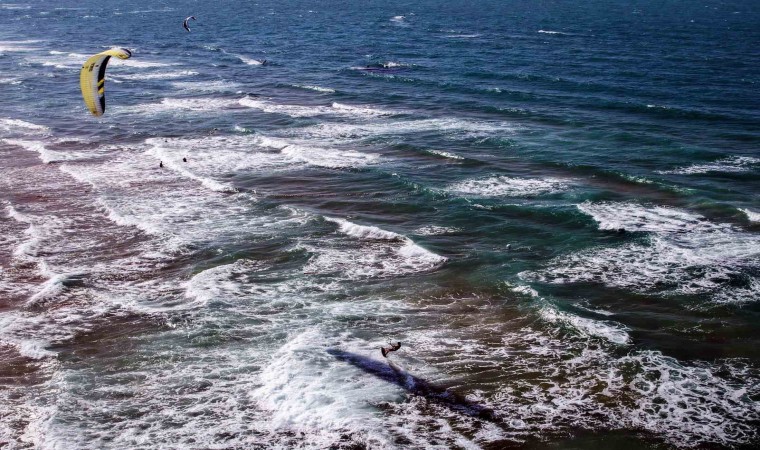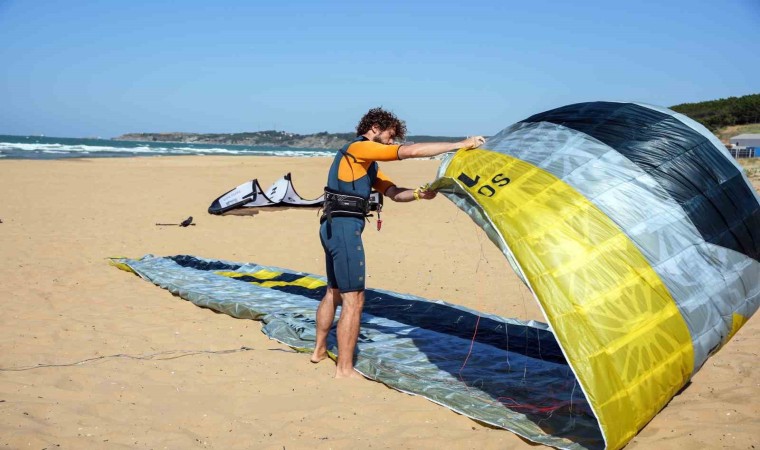‘Kitesurf’ olarak bilinen uçurtma sörfü yapan sporculardan Uğur İyigün, “Yaz rüzgarları başladı. Öğleden sonra poyraz esiyor. Mümkün olduğunca tadını çıkarmaya çalışıyoruz. Rüzgar olduğu sürece haftanın 3-4 günü buraya geliyoruz” dedi.