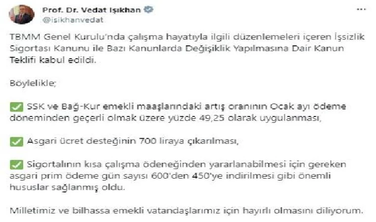 Ayrıca Çalışma ve Soyal Güvenlik Bakanı Vedat Işıkhan da, sosyal medya hesabından yaptığı açıklamayla yasalaşan kanun teklifiyle önemli hususları sağlandığını söyleyerek, "Milletimiz ve bilhassa emekli vatandaşlarımız için hayırlı olmasını diliyorum" dedi. (DHA)