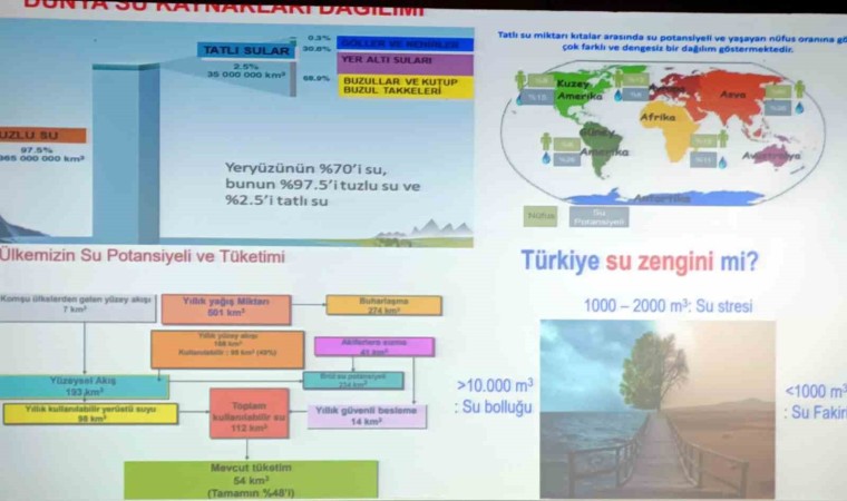 Türkiye’nin su fakirliği sınırında olduğunu, baz bölgelerinde kişi başına düşen su varlığı açısından ‘su fakiri’ olduğunu dile getiren Prof. Dr. Yusuf Demir, “Dünyadaki tatlı suların 10 binde 3’ünü kullanabiliyoruz. Tatlı suların yüzde 80’i buzulların altında bulunuyor. Suyun dünyadaki dağılımı da çok dengesiz. Türkiye’de ise yanlış bir algı var. ‘Su zengini bir ülke’ olarak biliyoruz. ’Türkiye su zenginidir’ diye yıllardır kandırıldık. Nüfusumuz 85 milyonun üzerinde. Toplam su varlığımız 112 milyar metreküp. Yani kişi başına yaklaşık bin 300 metreküp suyumuz düşüyor. Bir ülkenin su zengini olması için kişi başına 8 bin metreküpten fazla su düşmesi gerekiyor. Su fakirliği sınırı da bin metreküp. Yani Türkiye su fakirliği sınırında bir ülkedir. Türkiye’nin belirli bölgelerinde baktığınızda da su fakirliğine girmiş bulunuyoruz. Örneğin; Trakya, Marmara, Ege’de var olan su kişi başına bin metreküpün altında. Ciddi bir krizle karşı karşıyayız. Bilinenin aksine ülkemiz su zengini değil, fakirlik sınırında bir ülkedir” diye konuştu.