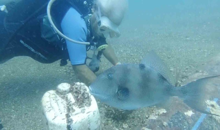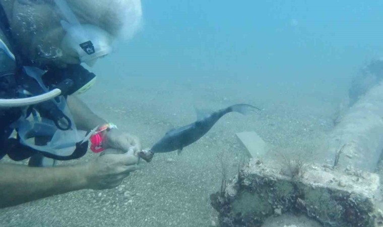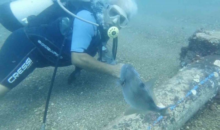 Gökoğlu, halk arasında çütre, domuz balığı ya da yasemin olarak adlandırılan balıkla arkadaş olduklarını belirterek, “Taşı boruya vurduğumuz an hemen kendisi geliyor. Bizden yiyecek istiyor. Bazen yiyecek getiriyoruz, bazen de bölgemiz için iyi bir tür olmayan istilacı midye türlerinden veriyoruz. Bize iyice alıştı, içimizden biri oldu artık. Her zaman bize gelip sataşıyor” dedi.