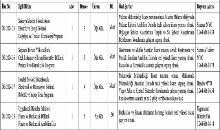 Sakarya Uygulamalı Bilimler Üniversitesi (SUBÜ); Sağlık Bilimleri Fakültesi, Uygulamalı Bilimler Fakültesi, Denizcilik Meslek Yüksekokulu, Hendek Meslek Yüksekokulu, Sakarya Meslek Yüksekokulu ve Sapanca Turizm Meslek Yüksekokulu’nda görev yapmak üzere akademik personel alım ilanına çıktı. İlanla; 2 doktor öğretim üyesi, 3 öğretim görevlisi ve 1 araştırma görevlisi alınacak. Kadrolar için ilanın Resmi Gazete’de yayımlandığı tarihten itibaren 15 gün içerisinde başvuru yapılabilecek. Başvuru süreci ve sonuçlar https://ilan.subu.edu.tr/ adresinden takip edilebilecek.