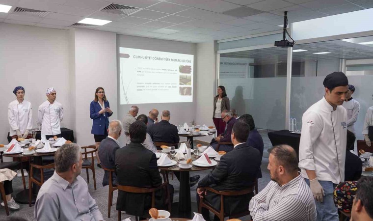 Gastronomi ve Mutfak Sanatları Bölüm Başkanı Doç. Dr. Serkan Şengül koordinatörlüğünde bölümün lisans ve lisansüstü düzeyinde öğrenim gören öğrenciler tarafından gerçekleştirilen etkinlik, Türkiye Cumhuriyeti’nde yıllara ve bölgelere göre mutfak özelliklerinin paylaşıldığı sunum ile başladı. Daha sonra misafirlere başlangıç olarak Türkiye Cumhuriyeti’nin kuruluşuna giden süreçteki önemli safhalardan birisi olan Çanakkale Savaşı’nda Osmanlı ordusuna verilen karavanaya atıfta bulunarak üzüm hoşafı ve somun ekmek servis edildi. Cumhuriyet Dönemi Türk Mutfağı yemekleri ile devam eden menüye katılımcılar tam not verdi.