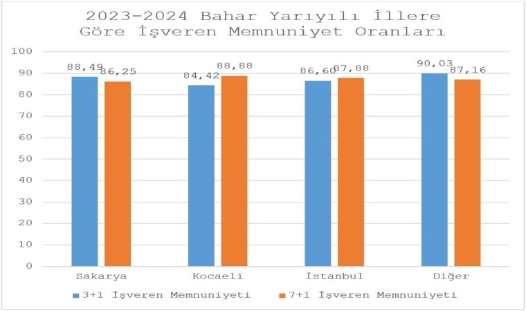 3+1 eğitim modeli için işverenlere yönelik yapılan ankete yüzde 35’i üretim, yüzde 45’i hizmet ve yüzde 10’u kamu sektöründen olmak üzere toplam 536 işveren katıldı. Katılanların yüzde 55’i Sakarya’dan, yüzde 19’u İstanbul’dan, yüzde 10’u Kocaeli’den, yüzde 16’sı ise diğer şehirlerden olurken; sorulan toplam 16 soru sonucunda işverenlerin 3+1 eğitim modelinden memnuniyet düzeyleri yüzde 88 olarak ölçüldü. 7+1 eğitim modeli için işverenlere yönelik yapılan ankete yüzde 50’si üretim, yüzde 38’i hizmet ve yüzde 2’si kamu sektöründe yer alan 196 işveren katıldı. Yüzde 36’sı Sakarya, yüzde 31’i İstanbul, yüzde 14’ü Kocaeli ve yüzde 19’u diğer illerden olan işverenlerin 7+1 eğitim modelinden memnuniyet düzeyleri yüzde 87 olarak ölçüldü.