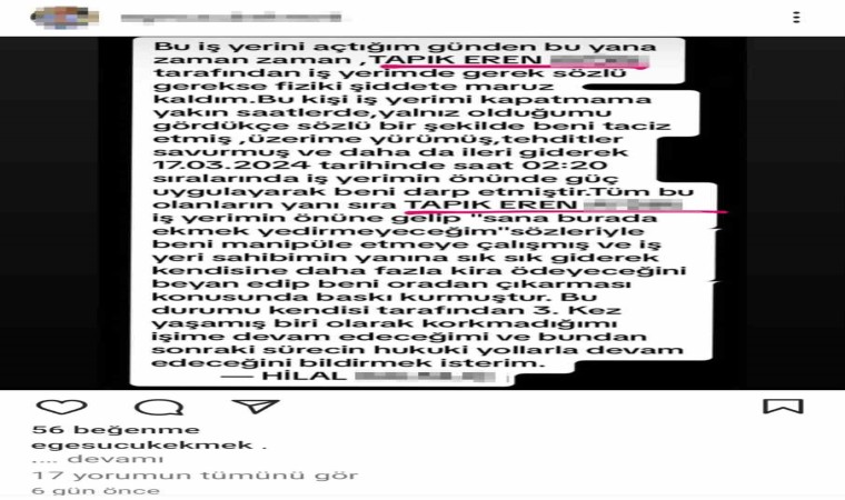 Hilal D. sosyal medya hesabından, “Bu iş yerini açtığım günden bu yana zaman zaman Tapık Eren A. tarafından iş yerimde gerek sözlü gerekse fiziki şiddete maruz kaldım. Bu kişi iş yerimi kapatmama yakın saatlerde yalnız olduğumu gördükçe sözlü bir şekilde beni taciz etmiş üzerime yürümüş tehditler savurmuş, daha da ileri giderek 17 Mart günü 02.20 sıralarında iş yerimin önünde bana güç uygulayarak beni darp etmiştir. Tüm bu olanların yanı sıra Tapık Eren A. iş yerimin önüne gelip ’sana burada ekmek yedirmeyeceğim’ sözleriyle beni manipüle etmeye çalışmış ve iş yeri sahibimin yanına sık sık giderek kendisine daha fazla kira ödeyeceğini beyan edip beni oradan çıkarması için baskı kurmuştur. Bu süreci 3 kez kendisi tarafından yaşadığımı ve işime devam edeceğimi, hakkımı hukuki yollarla arayacağımı belirtmek isterim” dedi.