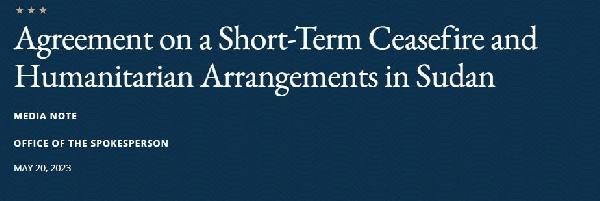 ABD Dışişleri Bakanlığı’ndan yapılan açıklamada, “Suudi Arabistan Krallığı ve Amerika Birleşik Devletleri, 20 Mayıs 2023 tarihinde Suudi Arabistan'ın Cidde kentinde Sudan Silahlı Kuvvetleri ve Hızlı Destek Kuvvetleri temsilcilerinin Kısa Süreli Ateşkes ve İnsani Düzenlemelere ilişkin bir anlaşma imzaladıklarını duyurmaktadır. Anlaşmanın imzalanmasından 48 saat sonra yürürlüğe girecek kısa süreli ateşkes, 7 gün süreyle yürürlükte kalacak ve her iki tarafın mutabakatıyla uzatılabilecektir” denildi.