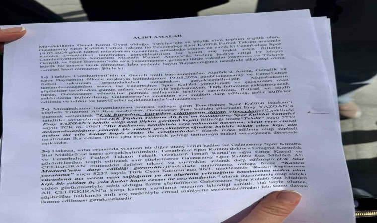 Yaşananların kabul edilemez olduğunu dile getiren Süheyl Batum, “Fenerbahçe Kulübü’nün Başkanı, camiamızın kurucu başkanı Ali Sami Yen’in adını taşıyan statta bizim genel sekreterimizi açıkça tehdit etmiş, parmağını sallayarak “Git buradan, yoksa dayak yersin” demiş. Bu konuşmanın üzerine gitmeyen stat görevlisinin linç edilmesini izlemiş daha sonrasında eski bir yöneticinin arkadan inanılmaz yumruklarına maruz kalmıştır. Bu durum kesinlikle kabul edilebilir bir olgu değildir. Bunu açıklıkla söyleyeceğiz. Hiç kimsenin bankadaki bol sıfırlı paraları, Galatasaray’a laf söyleme hakkını ve cüretini vermez. Türkiye’nin en zengin insanın sadece torunu olmak Galatasaray’a bu denli ağır hareketlerde bulunmayı haklı göstermez. Hiç kimse Galatasaray camiasına hırsızlar, şerefsizler gibi değerlendirmelerde bulunamaz. Biz bu lafları ve davranışları, Ali Koç’a ve orada bulunanlara iade ediyoruz. Ama bu yeterli değil. Türkiye eğer bir hukuk devletiyse bu yapılanların ceza kanununda karşılığı vardır. Bu katlanılabilecek bir şey değildir. Savcıya geldik ve gerekli suç duyurusunda bulunduk. Bundan sonrası ilk aşamada devletin ve hukukun görevidir. Bunların mutlaka takipçisi olacağız. Çünkü bizim aynı şekilde davranmamız düşünülemez. Ama devletin üzerine düşen görevi mutlaka yapması gerekir. Daha öncede söylemiştik. Galatasaray asla sahipsiz değildir. Galatasaray stadyumu, 20-30 kişi toplanarak basılabilecek bir yer değildir. Hiç kimsenin bunu yapamayacağını açıkça ortaya koyacağız. Galatasaray, dokunulabilecek bir kulüp değildir. 500 yıllık eğitim kurumlarına dayanan bir camia olma özelliğini kimsenin değiştirme hakkı yoktur” ifadelerini kullandı.