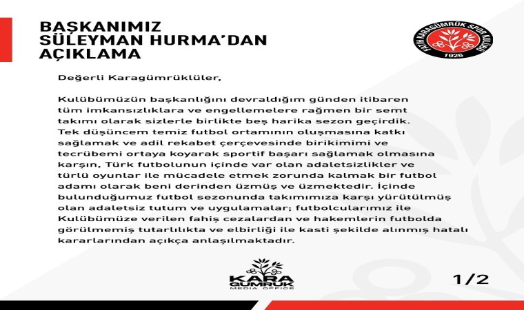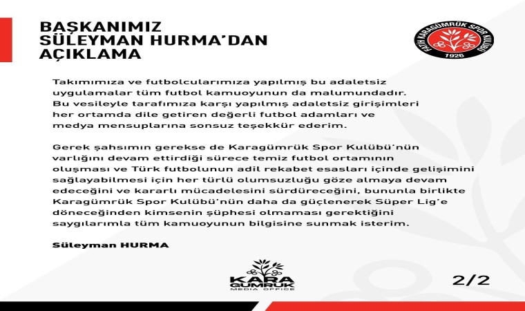 Fatih Karagümrük’ün daha da güçlenerek Süper Lig’e geri döneceğini söyleyen Süleyman Hurma, "Gerek şahsımın gerekse de Karagümrük Spor Kulübü’nün varlığını devam ettirdiği sürece temiz futbol ortamının oluşması ve Türk futbolunun adil rekabet esasları içinde gelişimini sağlayabilmesi için her türlü olumsuzluğu göze almaya devam edeceğini ve kararlı mücadelesini sürdüreceğini, bununla birlikte Karagümrük Spor Kulübü’nün daha da güçlenerek Süper Lig’e döneceğinden kimsenin şüphesi olmaması gerektiğini saygılarımla tüm kamuoyunun bilgisine sunmak isterim" diye konuştu.