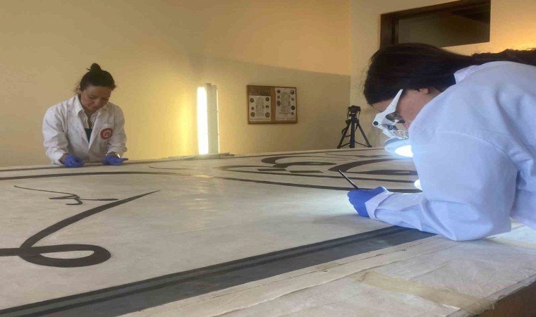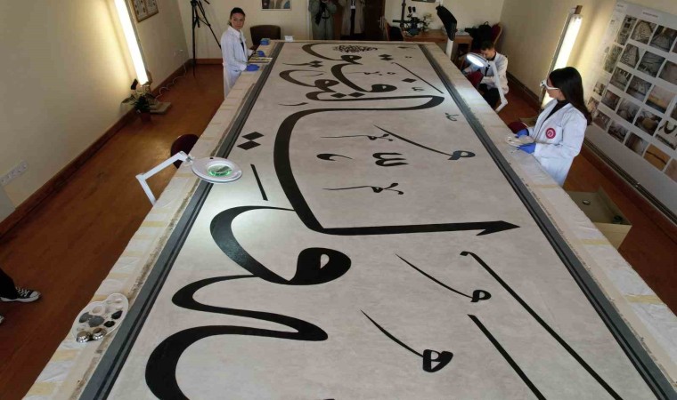 Topkapı Sarayı’nın paha biçilemez Hat Eserleri Koleksiyonu’na yönelik çalışmalar devam ederken Tablo Restorasyon ve Konservasyon Atölyesi’nde devasa boyutuyla dikkat çeken bir levhanın restorasyonu bitmek üzere. Sultan 2’nci Mahmud imzalı eser, 1810 - 1811 tarihini taşıyor. 208 santimetre ye 660 santimetre ölçülerine sahip eserde, beyaz boyalı bez üzerine siyah mürekkeple ve celi hatla “Allahu veliyyü’t - tevfik” yazıyor. Yaklaşık 14 metrekarelik ebadıyla benzerlerinden ayrılan eserin sergiye hazırlık çalışmasını, Milli Saraylar’ın restorasyon konusunda uzmanlık kazanmış dört kişilik ekibi yürütüyor. Restorasyonda son aşamaya gelinen 2. Mahmud imzalı hat levhasıyla ilgili Milli Saraylar Başkanı Dr. Yasin Yıldız basın mensuplarına bilgi verdi.