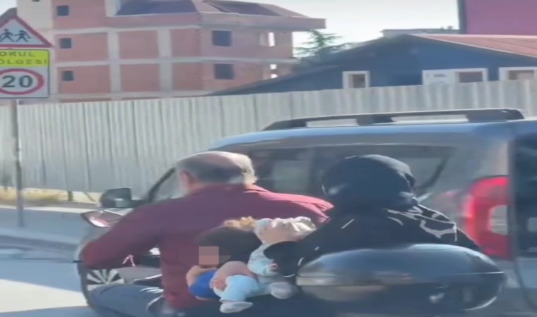 Görüntü İstanbul’un Sultanbeyli ilçesi Adil Mahallesi Bosna Bulvarı üzerinde geçtiğimiz gün öğle saatlerinde kaydedildi. Cadde üzerinde seyir halinde olan 34 MJ 5872 plakalı motosiklette bulunan aile yürekleri ağza getirdi. Motosiklet üzerinde 2’si bebek 4 kişilik aile canlarını hiçe sayarak kimseye aldırış etmeden yolculuk etti. Tehlikeli yolculuk anları ise seyir halindeki başka bir otomobil sürücüsünün cep telefonu kamerasına yansıdı.