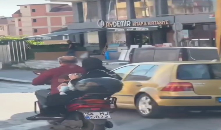 Sultanbeyli’de bir motosiklete 2’si bebek 4 kişi binen aileyi gören vatandaşlar, gözlerine inanamadı. O anlar başka bir sürücünün cep telefonu kamerasına yansıdı.