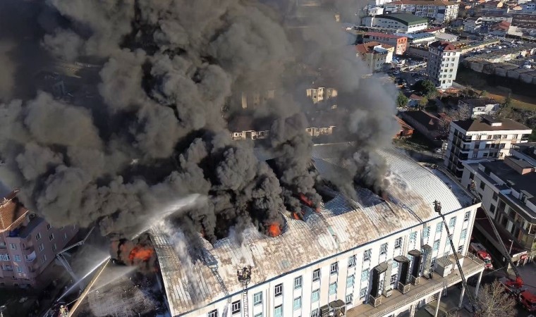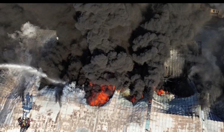 Sultanbeyli’nde 5 katlı iş merkezinde bulunan tekstil atölyesinde çıkan yangın dron ile havadan görüntülendi.