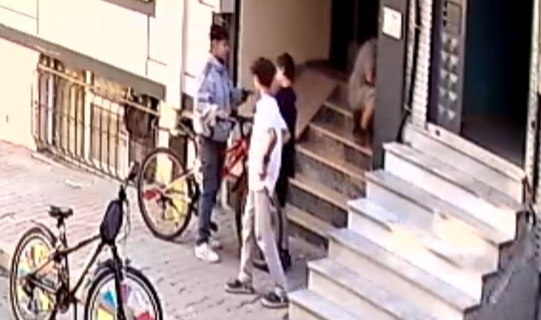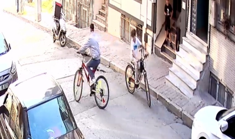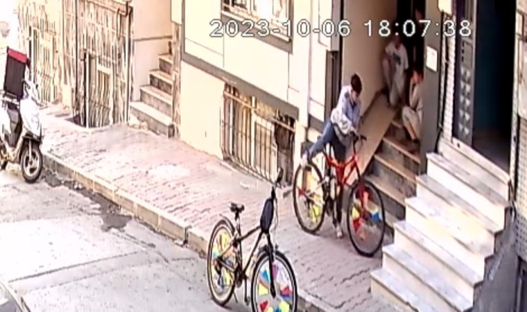 Sultangazi’de tur atma bahanesi ile plan kurup arkadaşları ile kapı önünde sohbet eden çocuğun bisikletini çalan hırsızlar güvenlik kamerasına yansıdı.