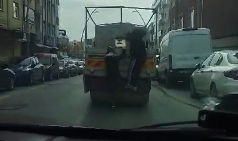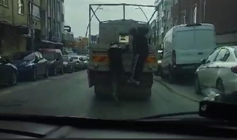 Sultangazi’de iki çocuk seyir halindeki kamyonetin kasasında tutunarak dakikalarca tehlikeli şekilde yolculuk yaptı. Çocuklar kendilerine görüntüleyen sürücüye de selam verirken, o anlar cep telefonu kamerasına yansıdı.