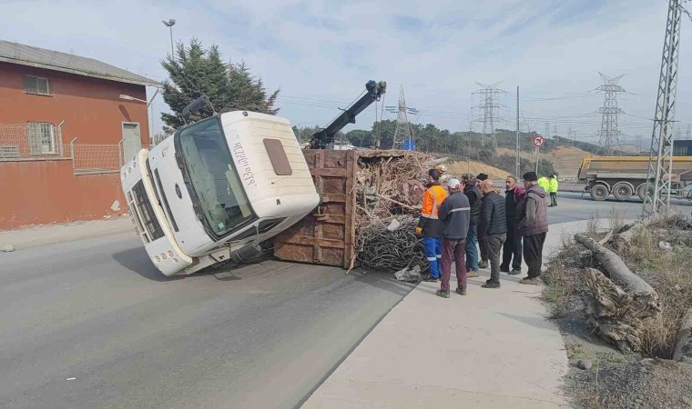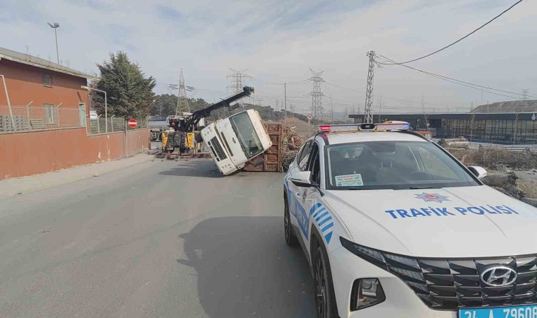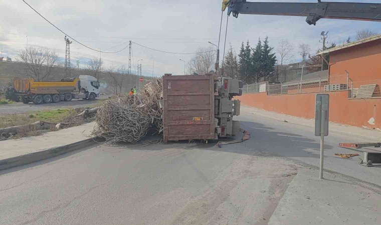 Sultangazi’de tonlarca ağırlıkta hurda demir yüklü tır, sürücünün viraja alamaması nedeniyle yan yattı. Kazada sürücü yara almadan kurtulurken, devrilen tırdaki hurda demirler yola döküldü.