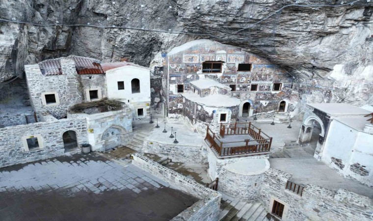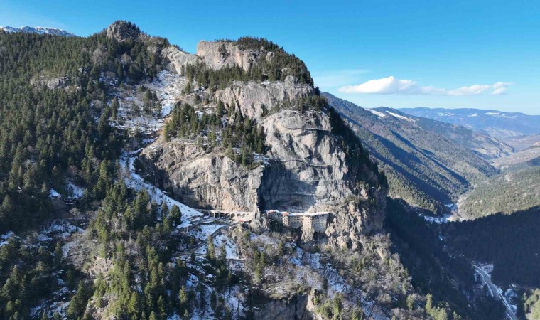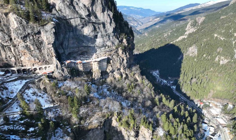 Trabzon’un Maçka ilçesinde bulunan ve Türkiye’nin en önemli turizm merkezlerinden birisi olan Sümela Manastırı kış mevsiminde bile ziyaretçileri ağırlarken manastırın havadan çekilen görüntüleri büyüledi.