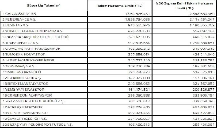 Türkiye Futbol Federasyonu'ndan yapılan açıklamaya göre en fazla harcama limitine yüzde 30 sapma payıyla birlikte 2 milyar 548 milyon TL ile Galatasaray sahip oldu. Fenerbahçe'nin harcama limiti 2 milyar 114 milyon TL olarak belirlenirken, 3'üncü sırada 1 milyar 190 milyon TL ile Beşiktaş yer aldı.