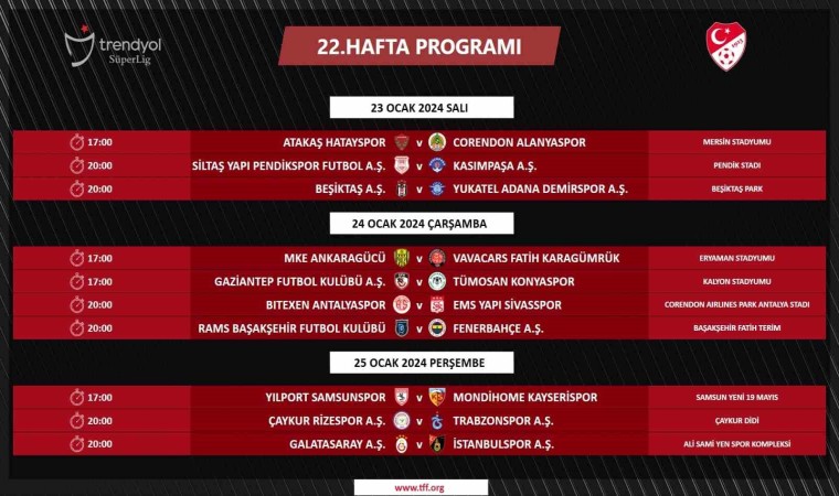Türkiye Futbol Federasyonu, Trendyol Süper Lig’in 21, 22 ve 23. hafta müsabaka programını duyurdu. TFF resmi internet sitesinden yapılan açıklamaya göre Süper Lig’de 21, 22 ve 23. haftanın karşılaşma programları şu şekilde: