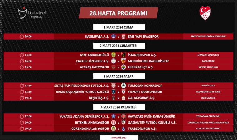 Trendyol Süper Lig’in 27, 28, 29 ve 30. haftalarında oynanacak maçların programı Türkiye Futbol Federasyonu (TFF) tarafından açıklandı. Ligin 28. haftasında Beşiktaş’ın, Galatasaray’ı ağırlayacağı mücadele 3 Mart Pazar günü saat 19.00’da yapılacak. Süper Lig’in 30. haftasında ise Trabzonspor ile Fenerbahçe 17 Mart Pazar günü saat 20.30’da karşı karşıya gelecek.