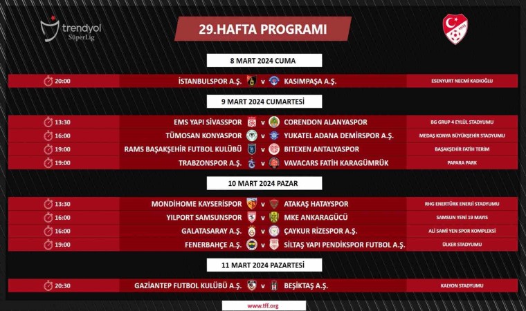 Trendyol Süper Lig’de 27, 28, 29 ve 30. haftalarda oynanacak maçların programı belli oldu. Buna göre Beşiktaş-Galatasaray derbisi 3 Mart Pazar günü, Trabzonspor-Fenerbahçe müsabakası da 17 Mart Pazar günü yapılacak.