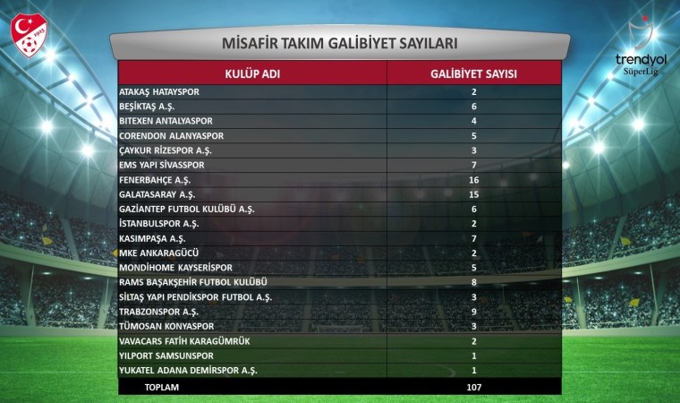 Sezon boyunca en fazla deplasman galibiyetini ise Fenerbahçe elde etti. 16 galibiyetli sarı-lacivertlileri 15 galibiyetle Galatasaray takip etti.