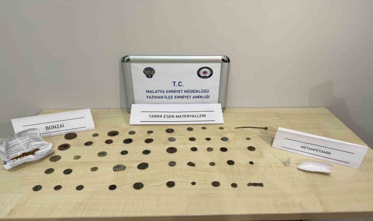 Malatya’nın Yazıhan ilçesinde şüphe üzerine durdurulan E.Ö. idaresindeki hafif ticari araçta arama yapan ekipler, aracın çekme belgeli, sürücünün ise ehliyetinin bulunmadığını tespit ederken 0.70 gram gram metamfetamin, 50 adet tarihi eser niteliği taşıyan para ve objeler ile 2.53 gram bonzai olarak bilinen uyuşturucu madde ele geçirdi.