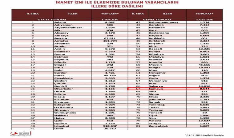 Samsun’da bakanlığın son resmi verilerine göre 8 bin 544 ikamet izinli, 8 bin 291 geçici koruma kapsamındaki sığınmacı olmak üzere toplam 16 bin 835 yabancının bulunduğu, Suriye’deki rejimin çökmesi ve geri dönüşlerin başlaması ile de bu sayının giderek azaldığı belirtildi.