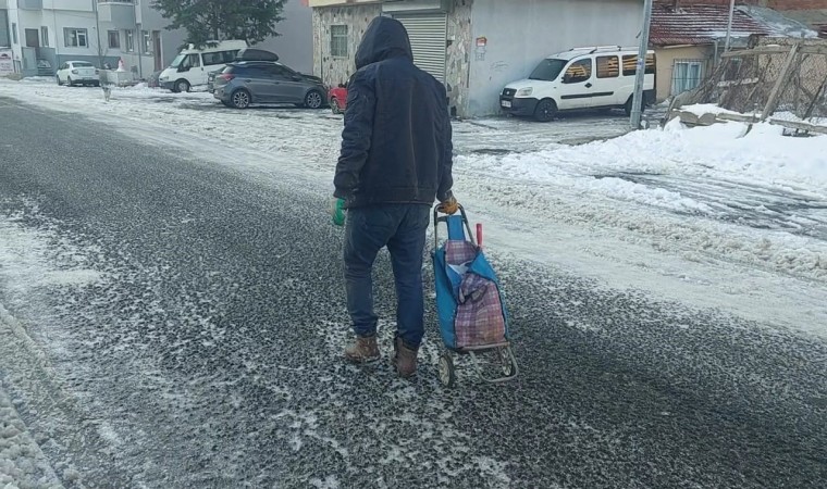 Tekirdağ’ın Süleymanpaşa ilçesinde adeta buz pistine dönen yollarda sürücülerin ve yayaların zorlu mücadelesi kameralara yansıdı.