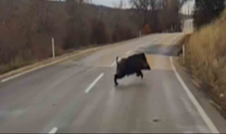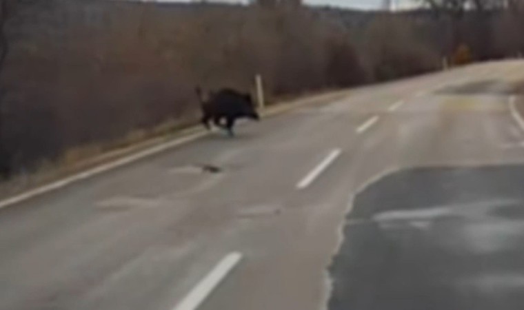 Eskişehir ile Mihalıççık arasında bulunan kara yoluna aniden çıkan yaban domuzunu fark eden sürücü yavaşlayarak hayvana çarpmaktan son anda kurtulurken, yaşananlar araç içi kamerasına yansıdı.