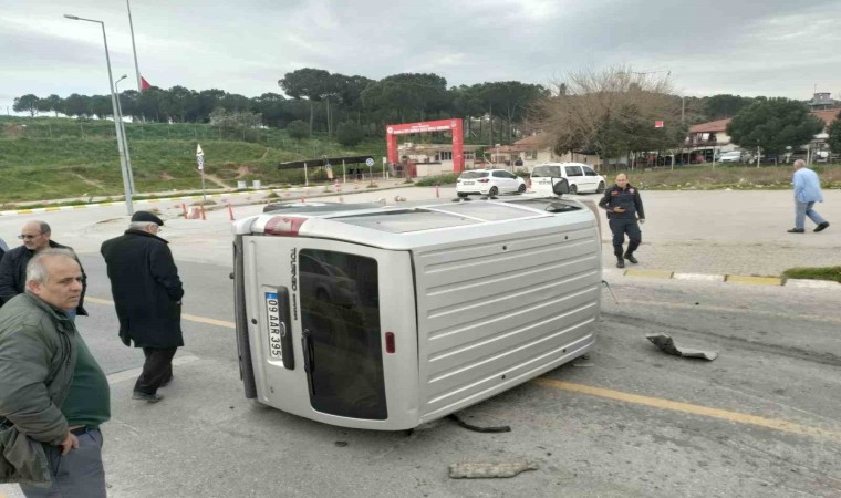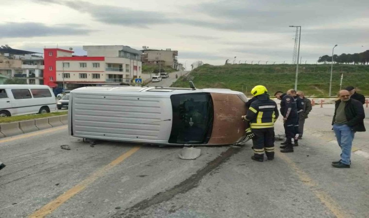 Aydın’ın Efeler ilçesinde sürücüsünün direksiyon hakimiyetini kaybetmesi sonucu refüje çarpan ticari araç yan yattı.