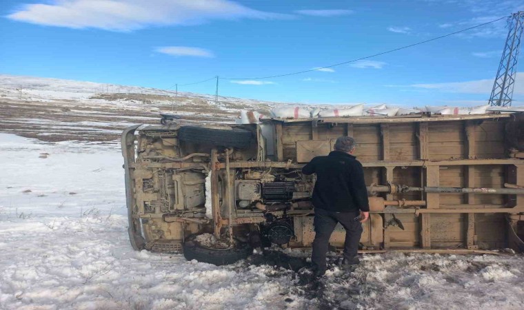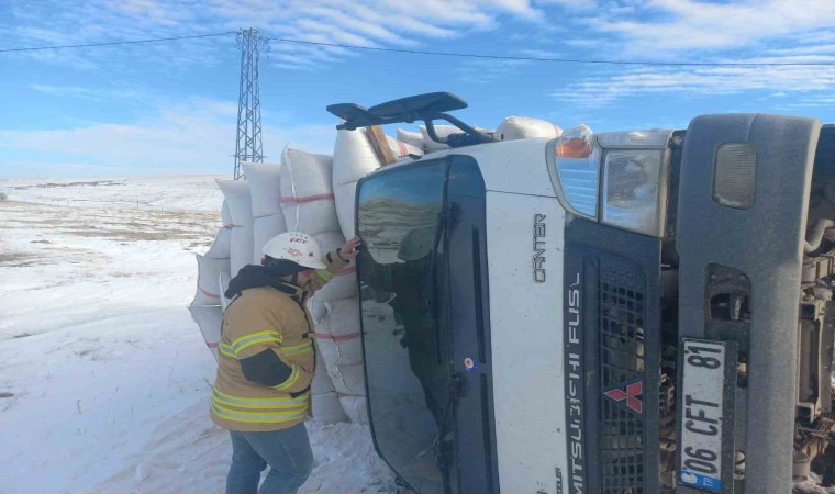 Susuz’da saman yüklü kamyonet devrildi. Kazada kamyonette sıkışına sürücü itfaiye ekiplerince çıkarıldı.