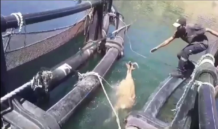 Tekin YALÇINKAYA/ ELAZIĞ, (DHA)- ELAZIĞ’da Fırat Nehri’ndeki alabalık üretim tesisinin kafes halatına takılarak suya düşen dağ keçisi, tesiste görevli işçiler tarafından kurtarıldı.