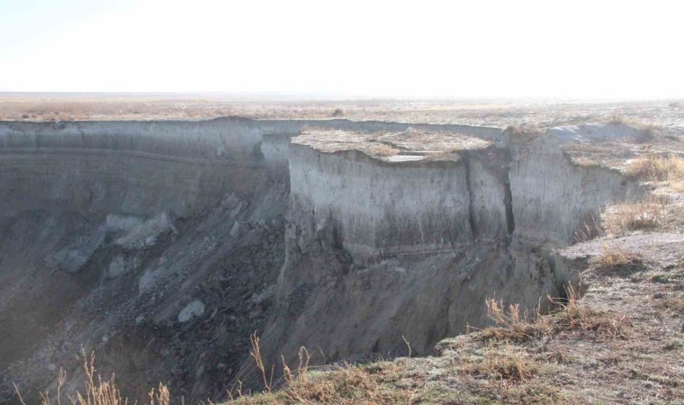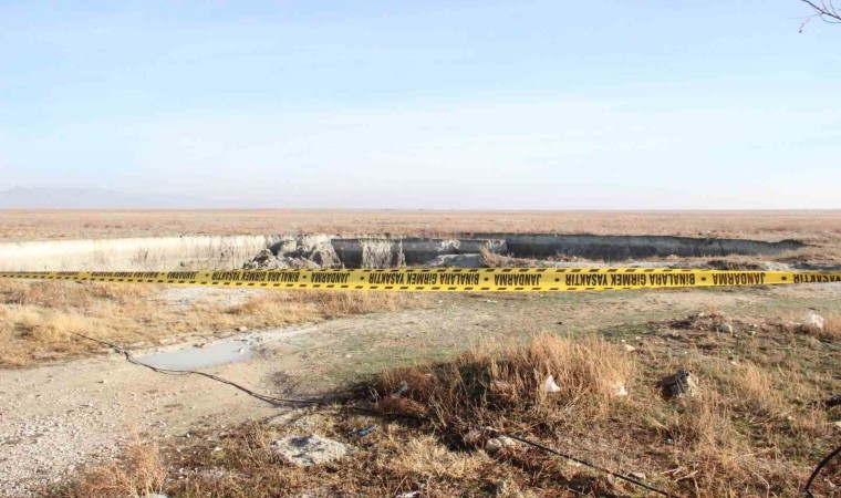 Karaman’da suyu çekilen kuş cenneti gölde dev obruk oluştu. Obruğun oluştuğu bölgede şerit çekilerek güvenlik tedbiri alındı.