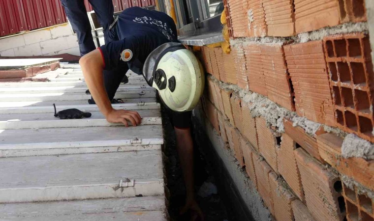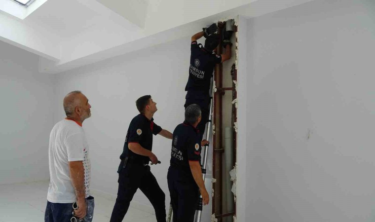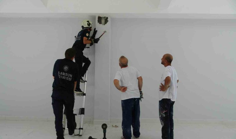 SAMSUN (İHA) – Samsun’da 3 gündür sıkıştığı su tahliye borusundan sesi gelen yavru kedi, binanın su tahliye borusunun geçtiği sahte kolon kırılarak kurtarıldı.