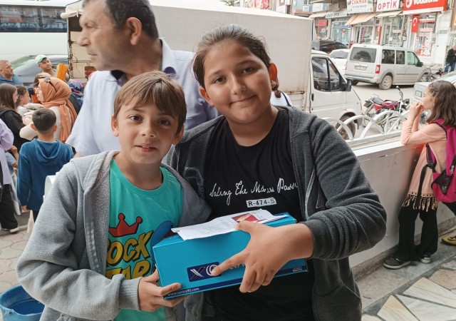 Afyonkarahisar’da hayırsever bir iş insanı takdir belgesini getiren öğrencilere ayakkabı hediye etti.