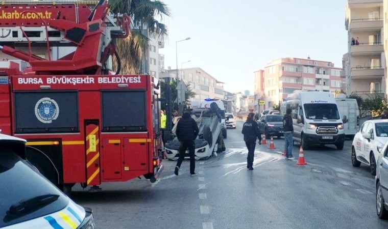 Bursa’da kafa kafaya çarpışan otomobillerden biri takla atarak durabildi. Takla atıp ters duran araçtan hem sürücü hem de yanındaki yolcu yara almadan kurtuldu.