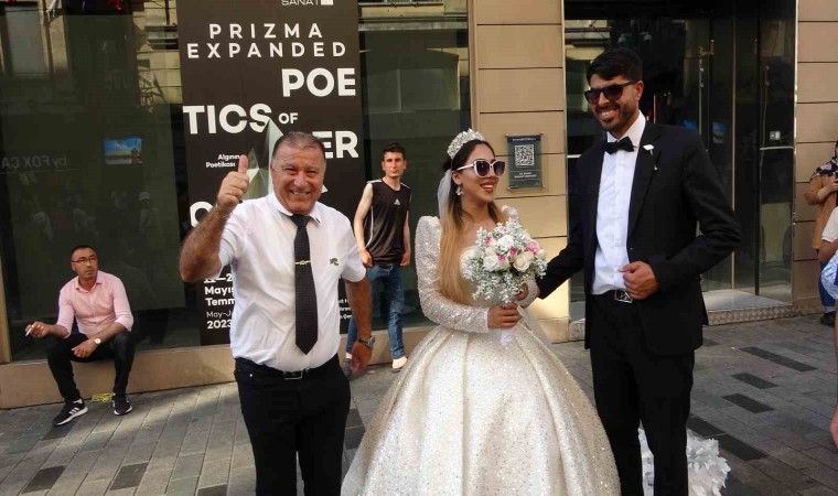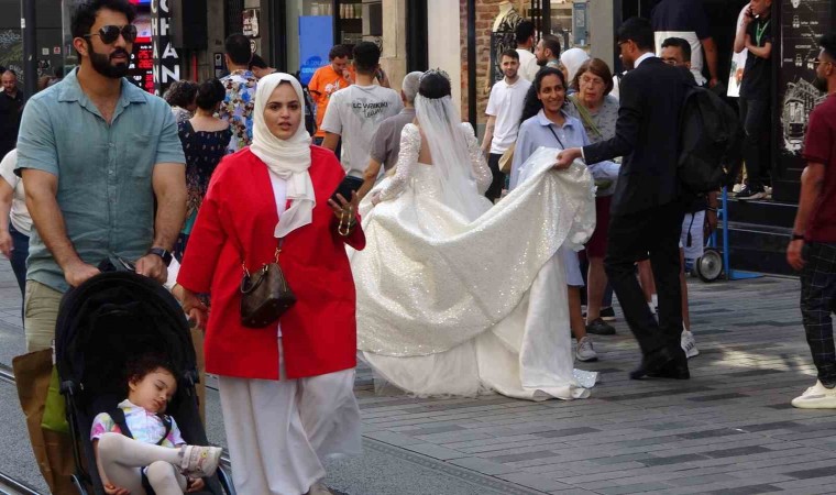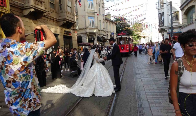 Taksim Meydanı’nda düğünleri için fotoğraf çekimi yapmak isteyen yabancı bir çift, çevredeki vatandaşların ilgi odağı haline geldi. İstiklal Caddesi boyunca çekimler yapmak isteyen çift, sık sık yanlarına gelen vatandaşlarla da fotoğraf çektirmek için durdu. Özellikle yabancı gelin ile fotoğraf çektirmek isteyen vatandaşlar, ortaya renkli görüntülerin çıkmasına neden oldu.