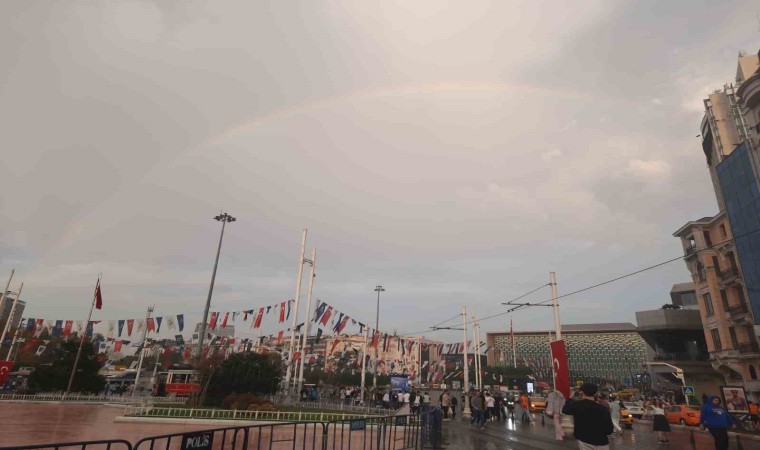 Meteoroloji Genel Müdürlüğü’nün uyarılarının ardından akşam saatlerinde Taksim Meydanı’nda yağmur etkili oldu. Uyarıları dikkate alan bazı vatandaşlar şemsiyeleri ile çıktıkları sokakta yağmurdan korunurken, hazırlıksız yakalanan vatandaşlar ise ıslanmaktan kurtulamadı. Kısa süren yağmur sonrası gökyüzünde oluşan gökkuşağı görenleri hayran bıraktı.
