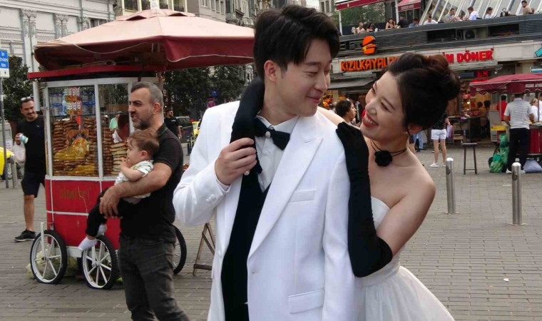İstanbul’da evlenerek Taksim Meydanı’nda düğün fotoğrafı çektiren Çinli çift ilgi odağı oldu.