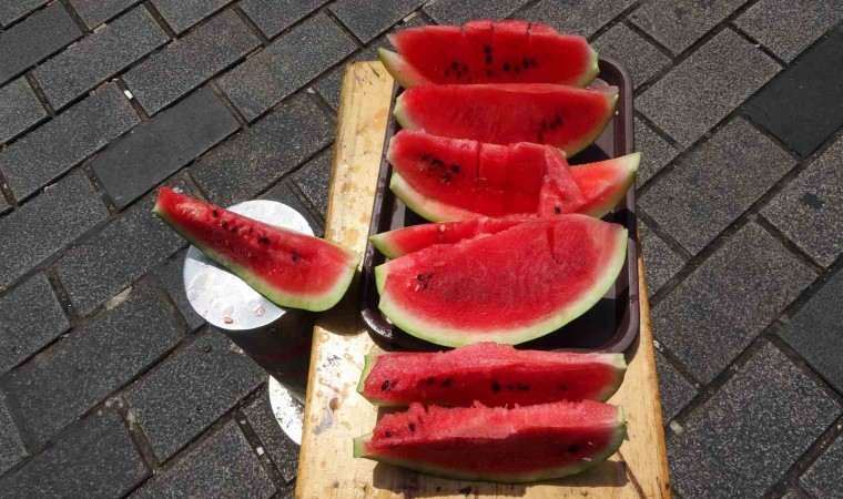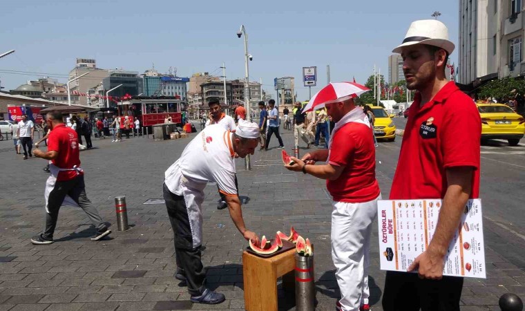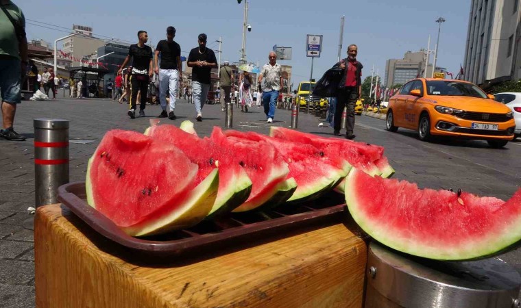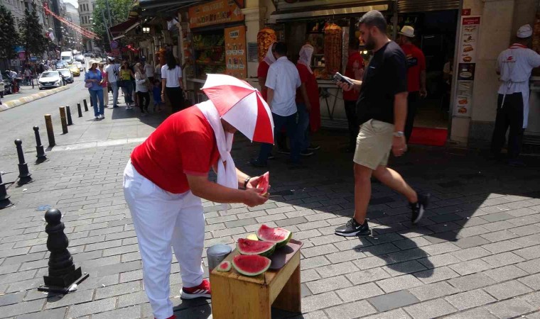 Hava sıcaklığının 39 dereceyi bulduğu megakent genelinde kavurucu sıcaklar etkili olmaya devam ediyor. Taksim ve İstiklal Caddesi’nde hissedilen sıcaklığın yüksek olmasından dolayı vatandaş zor anlar yaşarken, kavurucu sıcaklara karşı esnaf ilginç bir çözüm buldu. Güneşin altında karpuz kesen esnaf, sıcakta karpuz soğuttu. Esnaf, güneşle birlikte buz gibi olduğunu iddia ettiği karpuzu yerken, sıcaktan bunalan vatandaşa da ikram etti.