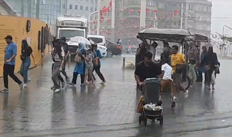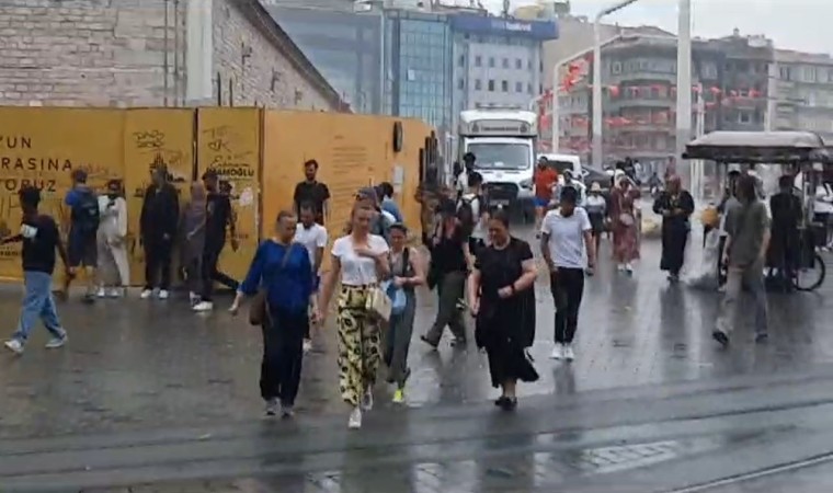 Taksim’de aniden bastıran sağanak nedeniyle vatandaşlar zor anlar yaşadı. Kısa sürede etkili olan yağmura hazırlıksız yakalananlar bina kenarlarına sığındı.