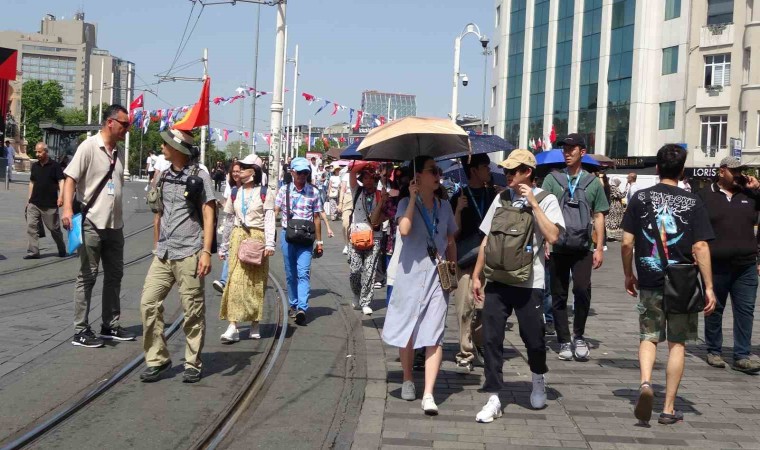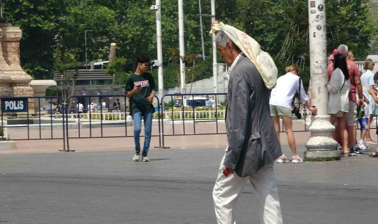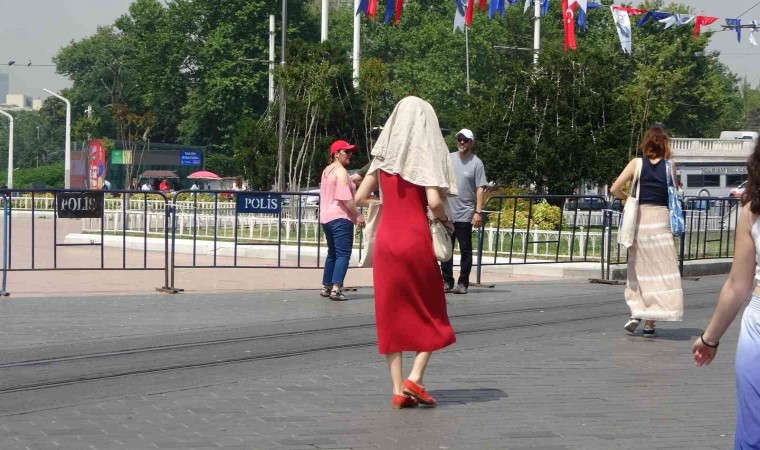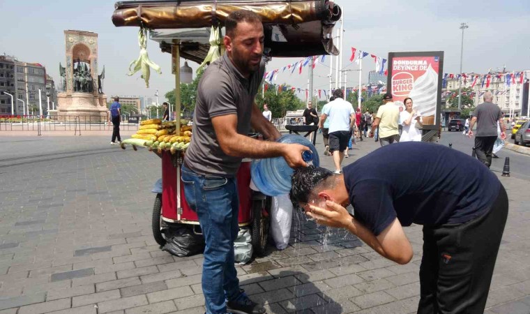 Hava sıcaklığının arttığı megakent genelinde kavurucu sıcaklar etkili olmaya devam ediyor. Taksim ve İstiklal Caddesi’nde hissedilen sıcaklığın yüksek olmasından dolayı vatandaş zor anlar yaşarken, kavurucu sıcaklara karşı esnaf kafasına damacanayla su döktü. Yerli ve yabancı turistler güneşin yakıcı etkisinden şemsiyelerle korunmaya çalıştı.