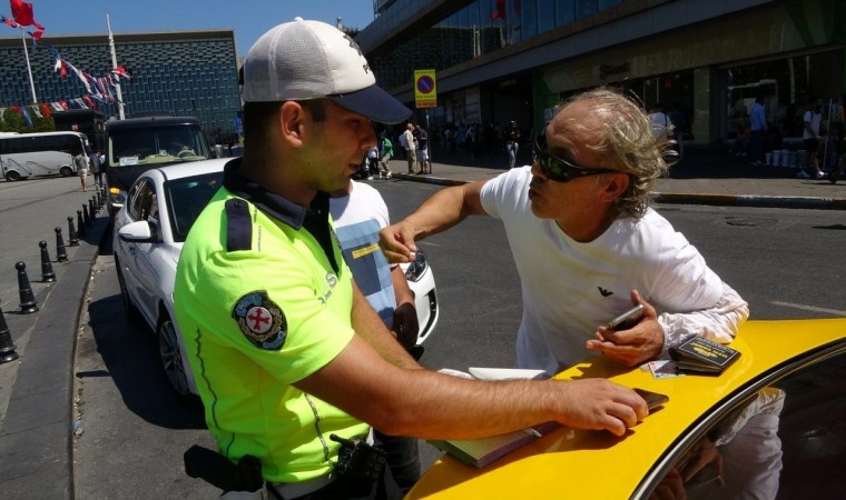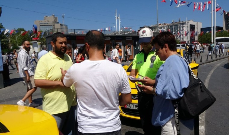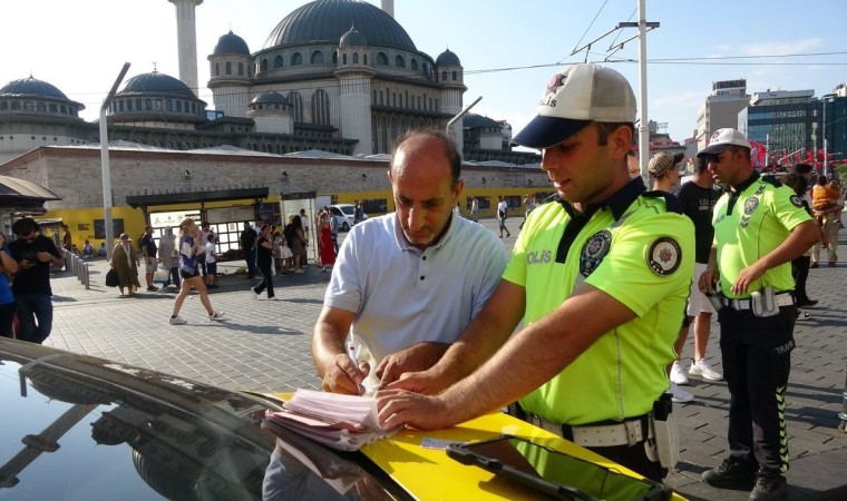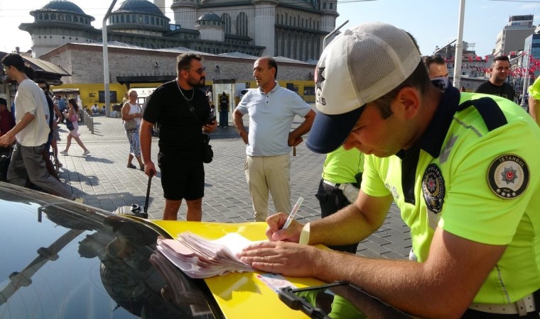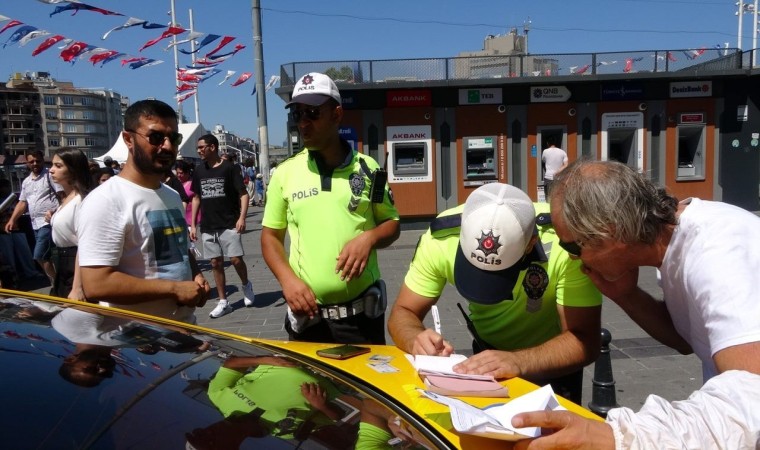 İstanbul Taksim Meydanı’nda trafik polislerinin yaptığı ticari taksi denetiminde 4 şoföre taksimetre açmadığı, müşteriyle pazarlık yaptığı, araç muayene tarihi geçtiği ve yolun ortasından yolcu aldığı için para cezaları kesildi.