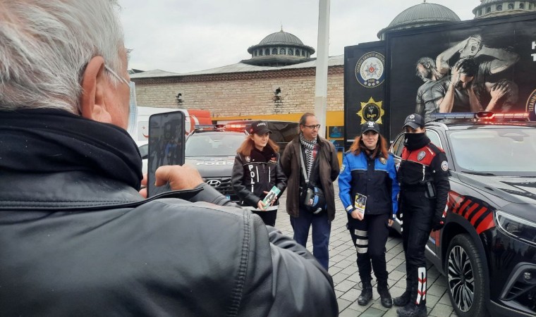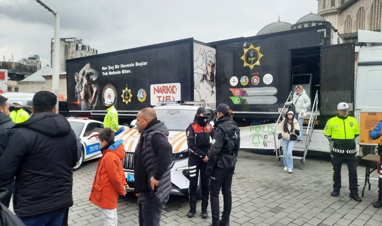 Taksim’deki NARKOTIR’da gençlere uyuşturucu maddelerin zararları ve nasıl korunacakları anlatıldı. NARKOTIR’ın önünde bekleyen özel eğitimli narkotik köpekleri ise vatandaşlardan yoğun ilgi gördü.