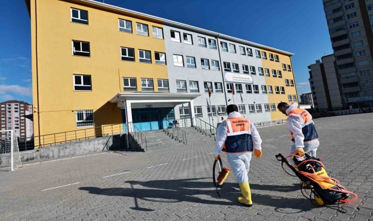 Talas genelindeki 59 eğitim kurumunun tamamı için kolları sıvayan Talas Belediyesi ekipleri, okullarda hijyen çalışması gerçekleştiriyor. İki ekip halinde yürütülen çalışmalarda bahçeler başta olmak üzere kazan daireleri de dahil edilerek lavabolar, tuvaletler, kapılar, koridorlar ve sınıflar ile okulun her noktası temizlenip dezenfekte ediliyor.