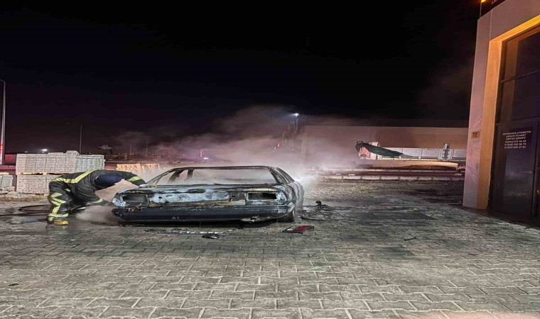 Konya’nın Karapınar ilçesinde, kaza yaptıktan sonra tamir için servis önüne bırakılan bir otomobil, gece saatlerinde alev alev yanarak demir yığınına döndü.