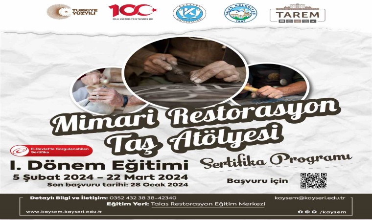 Merkezin mimari restorasyon ahşap, demir ve taş atölyesi birinci dönem sertifikalı eğitim programlarına kayıtlar 28 Ocak’ta sona erecek. 5 Şubat-22 Mart arasındaki ilk dönem eğitim programına kayıt yaptırmak isteyenler www.kaysem.kayseri.edu.tr adresinden veya 0352 432 3838-42340 numaralı telefondan detaylı bilgi alabilir.