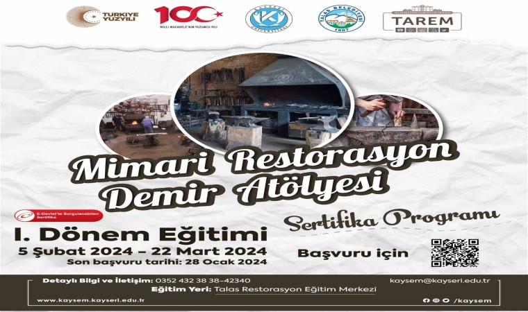 Talas Belediyesi ve Kayseri Üniversitesi (KAYÜ) tarafından hayata geçirilecek olan Zincidere’deki Talas Restorasyon Eğitim Merkezi’nde (TAREM) eğitim için geri sayım başladı. Bölgede taş, ahşap ve demir (ferforje) ustalığının yeniden canlanması amacıyla okula dönüştürülen tarihi binada ilk dönem kayıtları 28 Ocak’a kadar yapılabilecek.